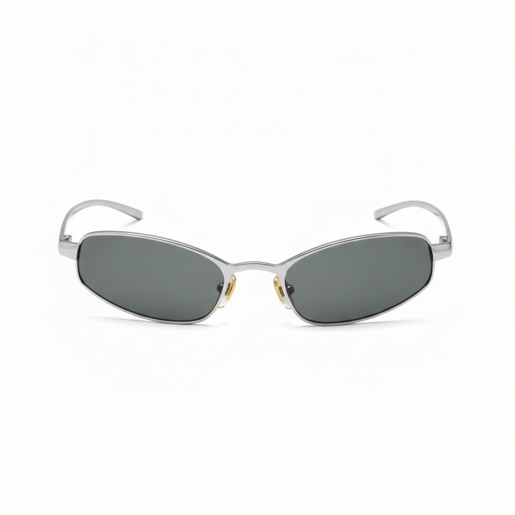 Narrow rectangular sunglasses in a sleek silver metal frame with flat olive-green lenses. The ultra-slim profile and sharp angular lines deliver a stripped-back, no-nonsense edge, with gold-tipped nose pads adding a single subtle contrast detail. Lightweight, low-slung temples complete the covert look. For the ones who disappear in plain sight.