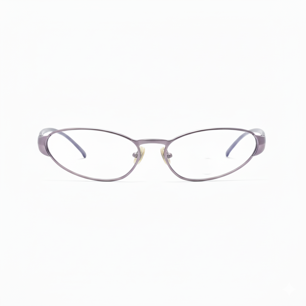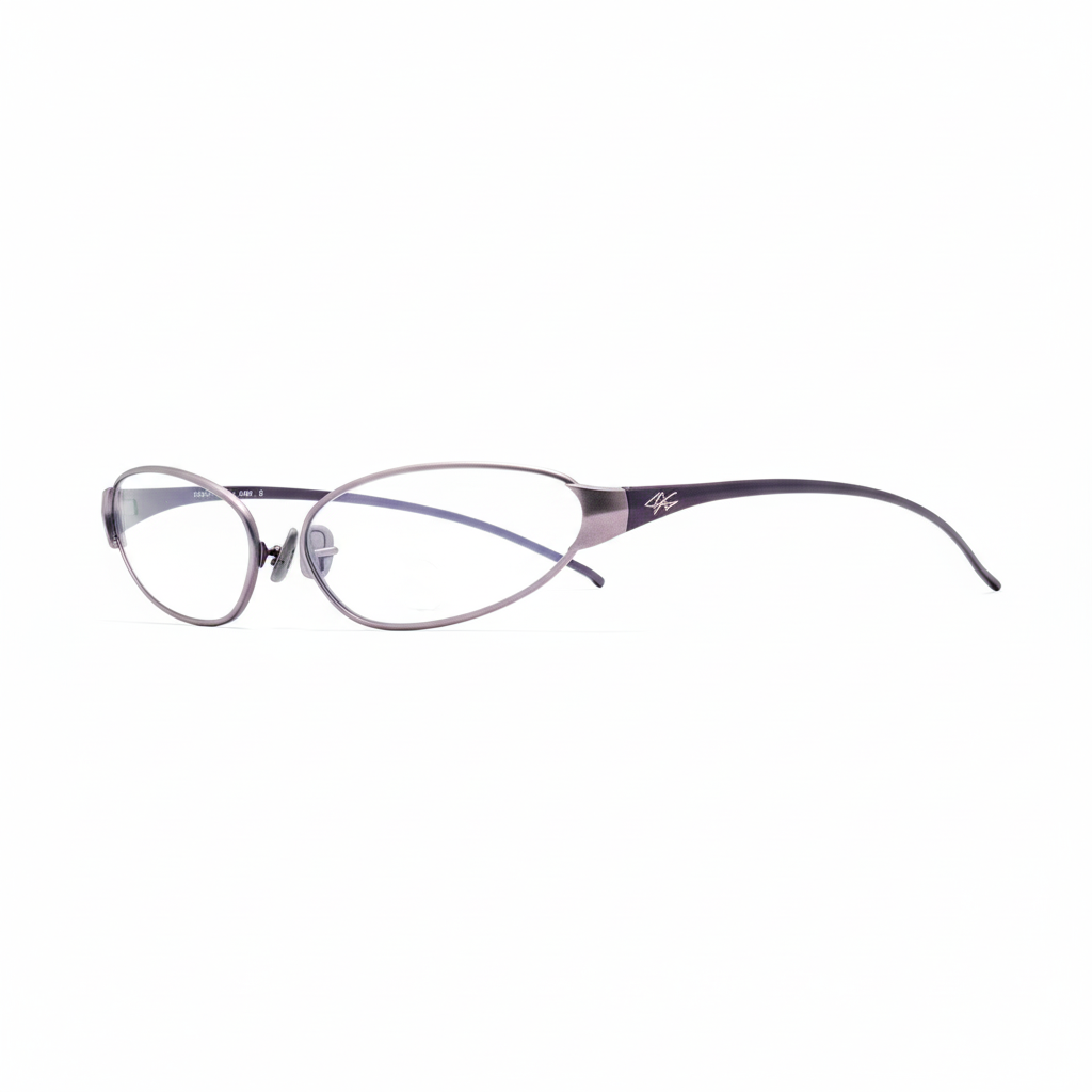 Avant-garde oval eyeglasses with a dramatic gunmetal-to-deep-purple gradient frame and clear lenses. The striking open-rim design features an elongated outer contour that extends beyond the lens, creating a bold sculptural silhouette. Wide, tapered temples with an engraved logo accent add a high-fashion edge. For anyone who treats eyewear as armor.